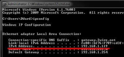 The "Default Gateway" is another important number. If local LAN clients can't connect to you, run this command prompt on the other computers and verify that the Default Gateway is the same.